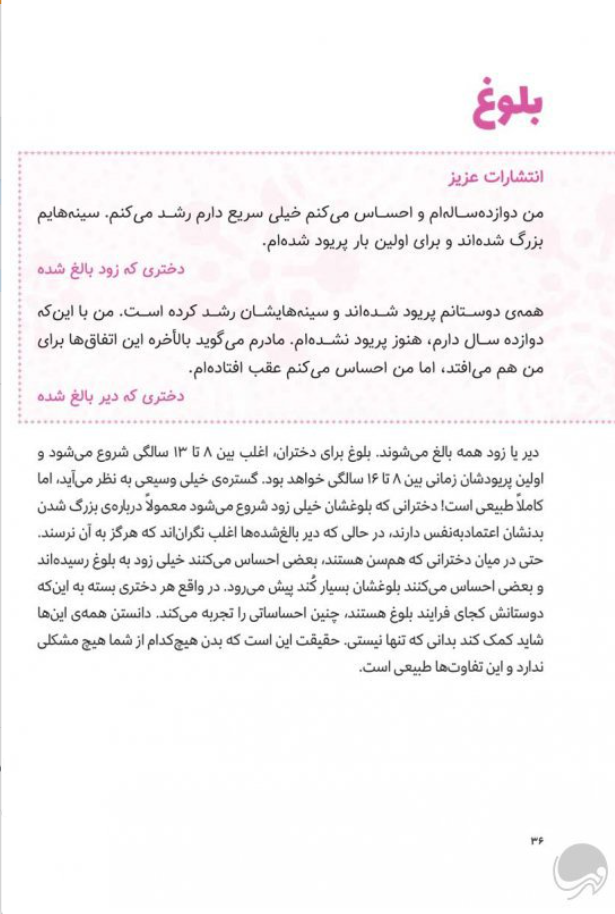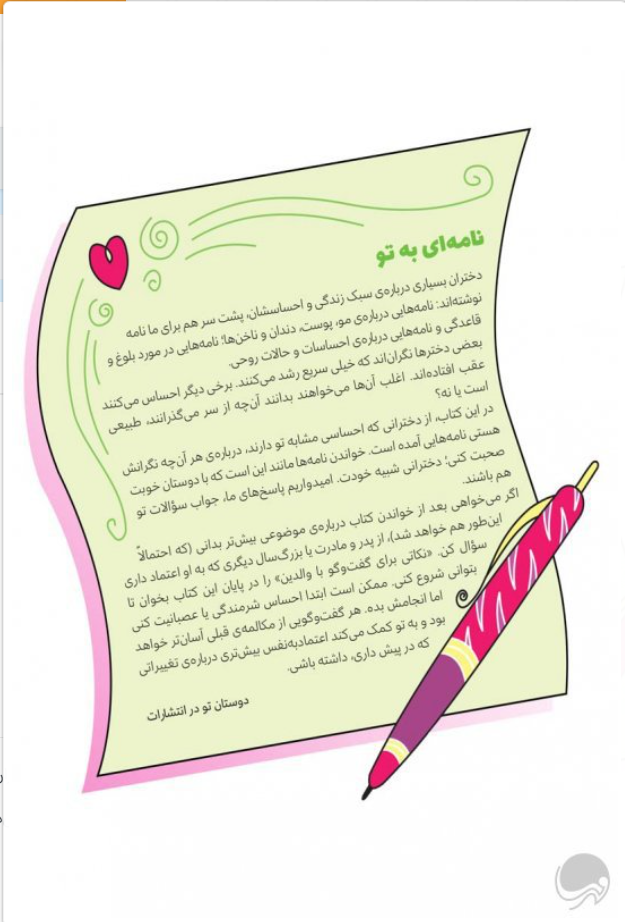 تغییرات بدنت تو را نگران کردهاند؟ نگران نباش، این تغییرات برای دخترهای دیگر هم پیش میآید و آنها را هم نگران میکند. این کتاب، به نامهها و پرسشهای دختران همسن و سالت در هر زمینهای پاسخ میدهد؛ از جوش زدن صورتشان گرفته تا قاعدگی و تغییرات خلق و خو. همچنین به دخترها یاد میدهد که چهطور سؤالها یا دغدغههایشان را بدون ترس و یا پنهانکاری با والدین مطرح کنند
